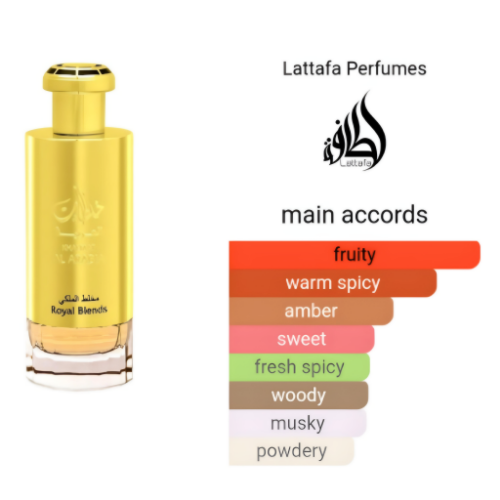 Khaltaat Al Arabia Royal Blends by Lattafa Perfumes is a Oriental Spicy fragrance for women and men. Khaltaat Al Arabia Royal Blends was launched in 2020. Top notes are Fruits and Apple; middle notes are Spices, Nutmeg and Clove; base notes are Amber, Woodsy Notes and Musk.