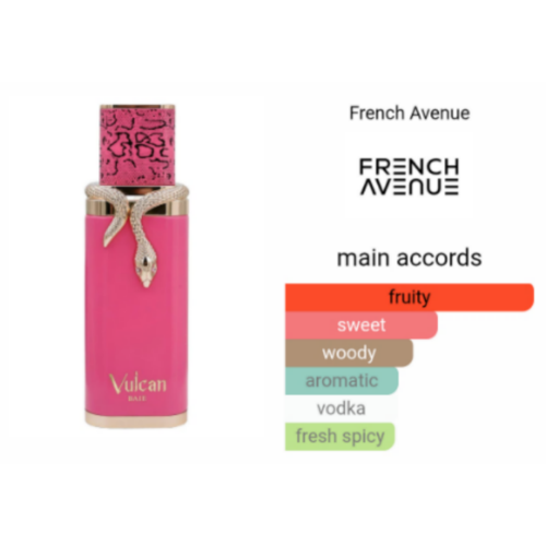 Vulcan Baie by French Avenue is a Floral Fruity fragrance for women and men. This is a new fragrance. Vulcan Baie was launched in 2025. Top notes are Black Currant, Blackberry, Bergamot and Rosemary; middle notes are Raspberry, Vodka, Lily of the Valley and Basil; base notes are Strawberry, Peach, Amber, Sandalwood, Musk, Patchouli and Incense.